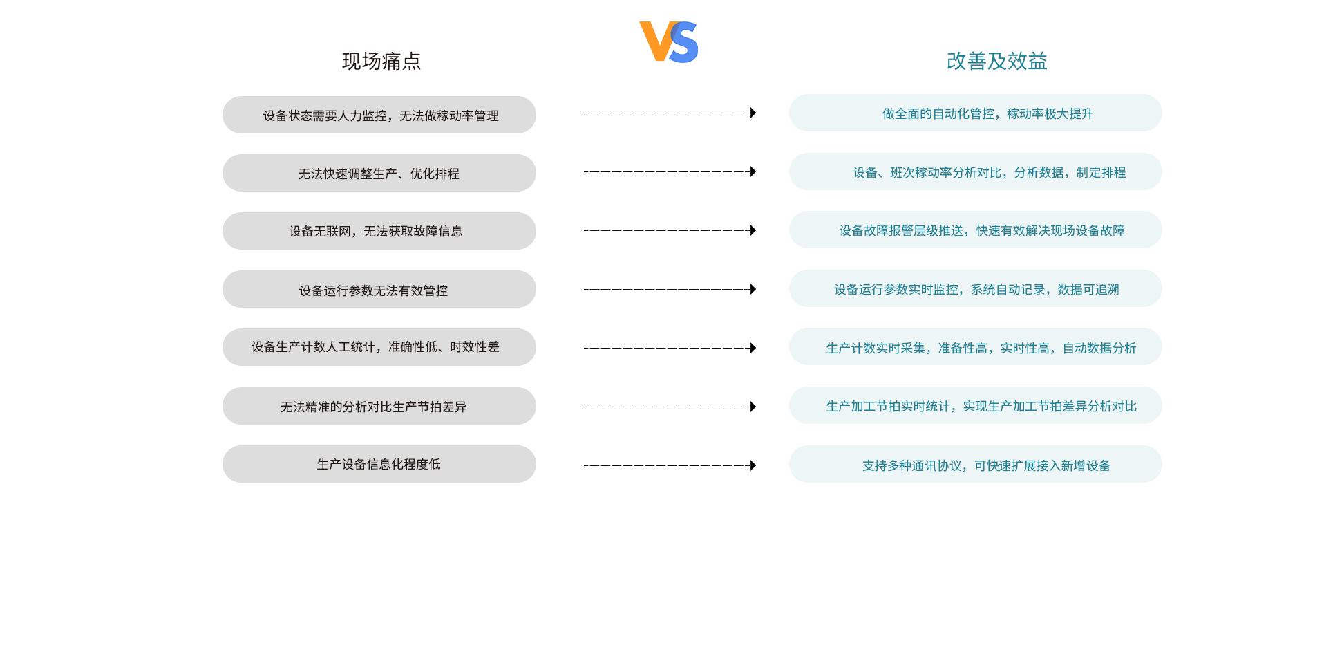 设备实时状态采集(运行、空闲、报警等状态)及设备利用率分析,提高设备运行效率,调整产线平衡,消除生产瓶颈。设备运行参数采集分析,提高生产产品质量,并记录生产数据,便于质量追溯。实现对全厂设备实时监控, 并通过数据报表及实时预警提示,辅助设备运维管理。